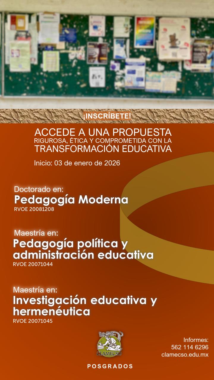 - Con base en una visión interdisciplinaria, impartimos la Maestría en Pedagogía, Política y Administración Educativa, cuyo fin es analizar, reflexionar y mejorar los conocimientos pedagógicos y didácticos, además de comprender los procesos de gestión y administración de instituciones educativas (RVOE 20071044).