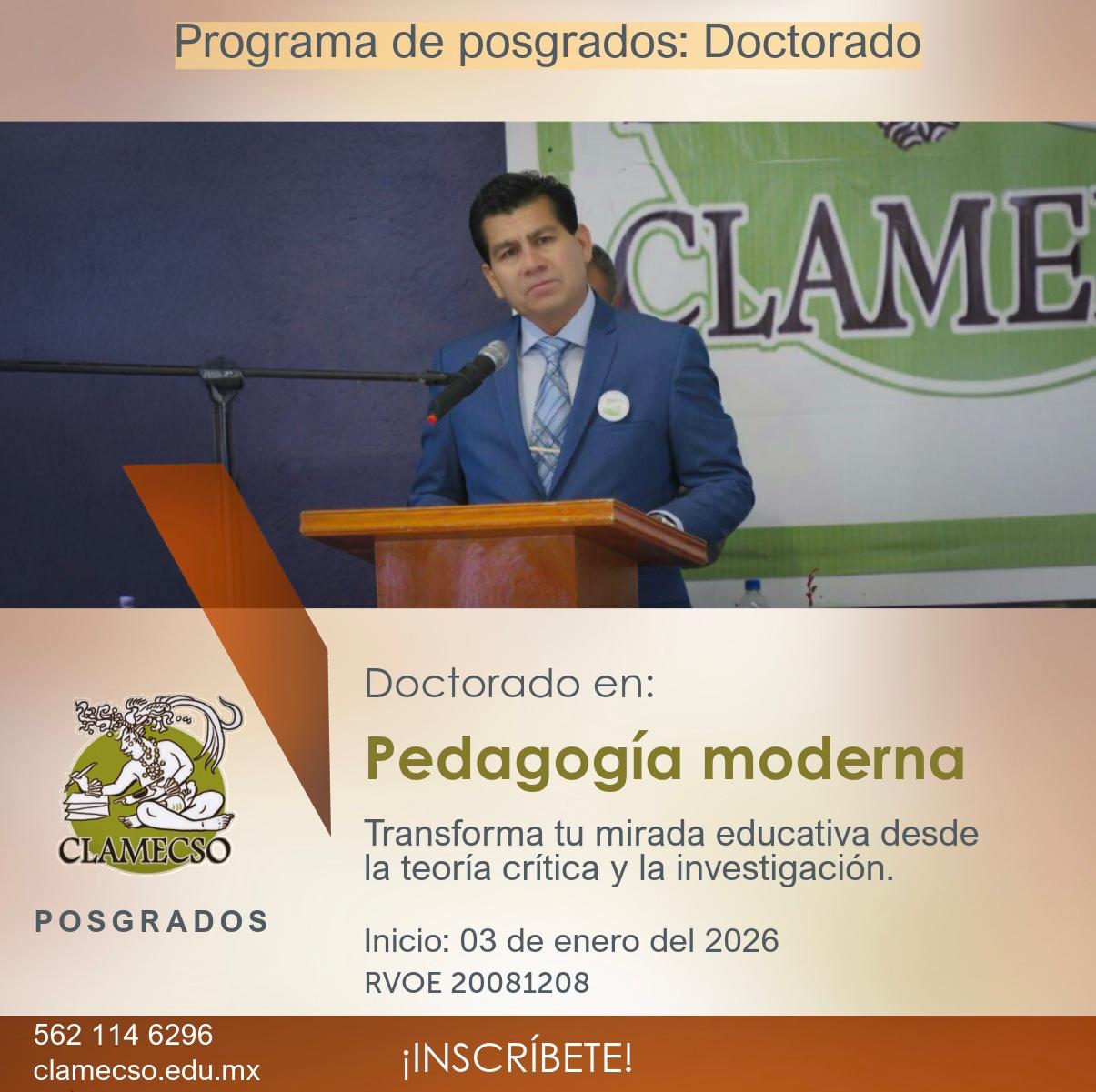 - El programa de doctorado en Pedagogía Moderna forja investigadores y profesionales en pedagogía desde cualquier perspectiva antropológica, comparada, curricular, histórica, institucional, profesional y/o tecnológica (RVOE 20081208).